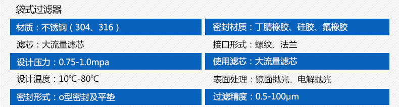 袋式過濾器采用優(yōu)質(zhì)不銹鋼精制而成,表面鏡面拋光處理,亞光或噴砂處理。袋式過濾器是一種新型的過濾系統(tǒng),一種專業(yè)液體過濾設備,過濾機內(nèi)部有金屬網(wǎng)藍支撐濾袋,液體由入口流進,經(jīng)濾袋過濾后從出口流出,雜質(zhì)被攔截在濾袋中,從而有效的除去了大小不同的顆粒物,從而達到液體過濾,凈化,分離回收的目的,從而更換濾袋或清洗濾袋后可繼續(xù)使用。結(jié)構新穎,體積小,操作簡單靈活,節(jié)能,高效,密閉工作,適用性強的多用途過濾設備。