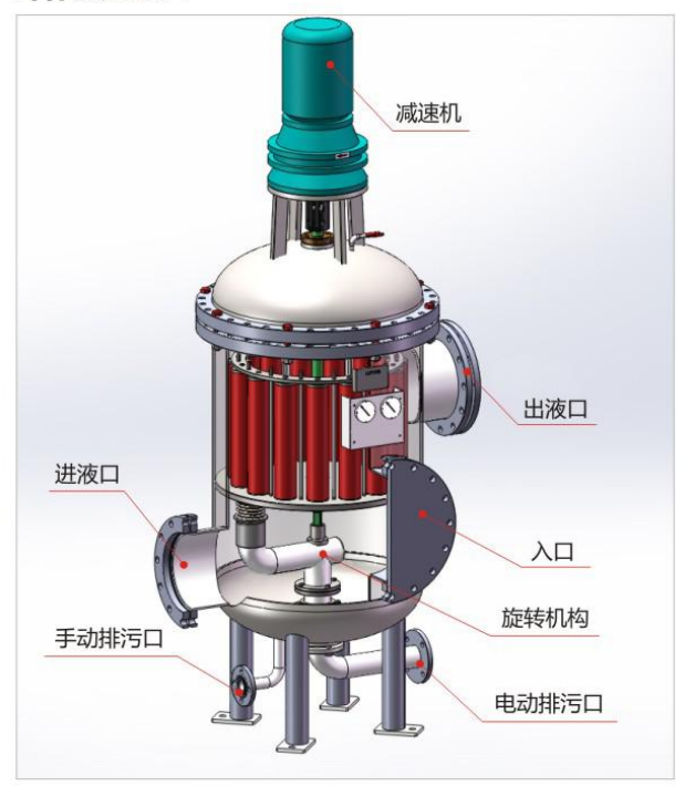 多柱式自清洗過濾器為轉(zhuǎn)臂式結(jié)構(gòu)過濾器,是一種集約化的過濾器,它主要由外殼、電動機、減速機、差壓控制器、CPU可編程控制器、電控箱、閥門、精密濾芯、支撐部件、反洗臂等組成。多個濾筒安裝于一個過濾器筒體內(nèi),結(jié)構(gòu)緊湊。被過濾的液體從進口進入過濾器,經(jīng)過下固定板進入濾網(wǎng),液體從濾網(wǎng)內(nèi)側(cè)流向外側(cè),并從濾筒出口流出過濾器;反沖洗排出的雜質(zhì)從排污口排出。過程描述:液體從濾網(wǎng)內(nèi)側(cè)流向外側(cè)過程中,固體顆粒被截留在濾網(wǎng)內(nèi)側(cè)。隨著污染物的增多,過濾器污染側(cè)和清潔側(cè)之間的壓差也逐漸增大。當(dāng)壓差達到設(shè)定值時,壓差表發(fā)訊,過濾器開始自動反沖洗工作過程。