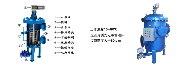 立式不銹鋼刷式自清洗過濾器當(dāng)水從進(jìn)水口進(jìn)入過濾器濾筒內(nèi)部,雜質(zhì)被攔截在過濾筒內(nèi)壁,過濾后的干凈水從出水口流出,當(dāng)濾筒內(nèi)壁的雜質(zhì)越積越多時,過濾器進(jìn)出口的壓差達(dá)到預(yù)設(shè)值或達(dá)到清洗時間或手動控制時,過濾器將開始自清洗整個自清洗過程包含兩個步驟:打開位于過濾器上的自動排污閥;電機(jī)帶動過濾器濾網(wǎng)內(nèi)的清洗刷,被濾網(wǎng)所攔截下來的雜質(zhì)從排污閥排出。清洗時系統(tǒng)不斷流,過濾器的整個運(yùn)行過程由隨機(jī)配備的一個智能控制箱來控制,控制方式可選壓差、時間、手動及PLC控制;結(jié)構(gòu)示意圖如下: